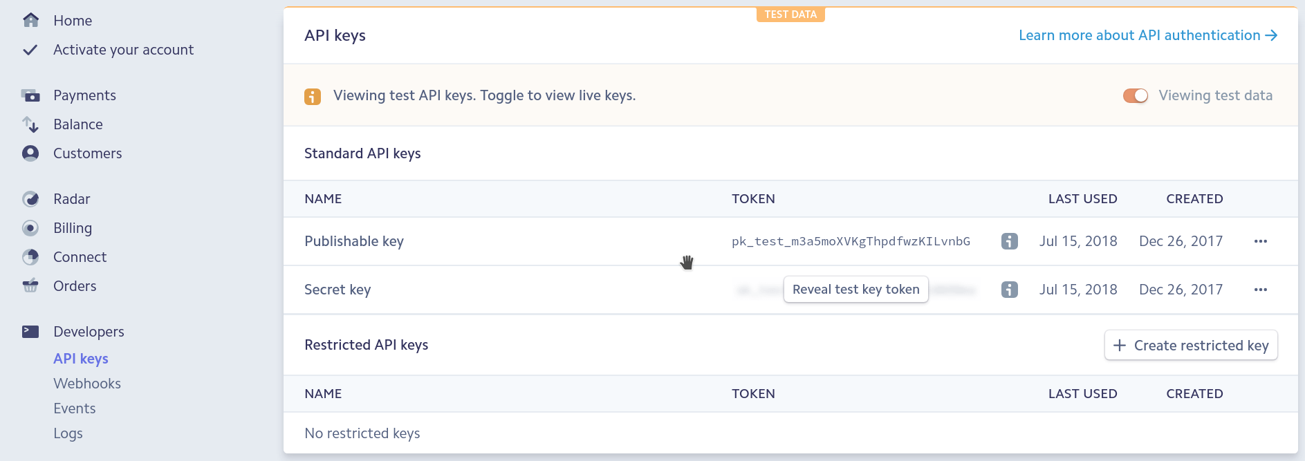 Then go to the stripe dashboard and grab your secret key. We will set it as an environment variable in Firebase to prevent it from being exposed publicly.